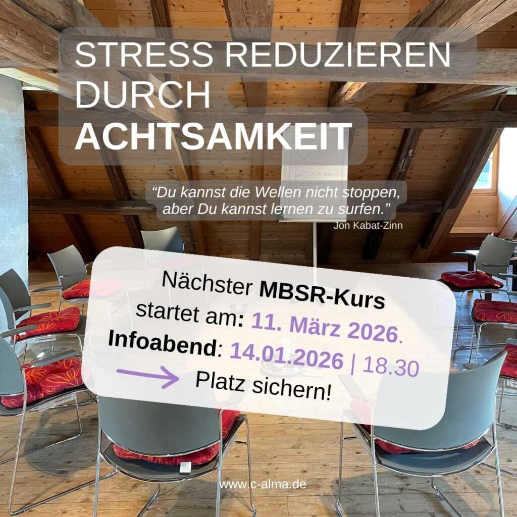 Wichtiger Hinweis: Ein MBSR Kurs kann ein sinnvoller ergänzender Ansatz zu einer medizinischen und/oder psychotherapeutischen Behandlung sein. Der MBSR-Kurs kann eine erforderliche Behandlung jedoch nicht ersetzen.